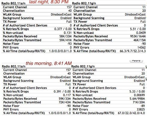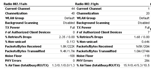 Here are screen shots of last night (all left the building) and this morning (nobody in yet). I confirmed that there were no stations by checking the event logs of the AP. What I find interesting is that the AirTime is still pretty high, even RX is 42% after a silent night. And the fairies obviously downloaded 5 MB during the night, while uploading 800 MB, bypassing the event logs.