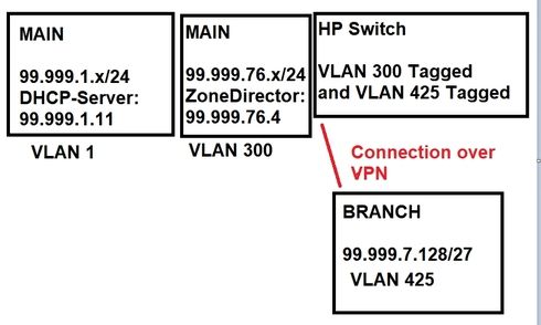 The DHCP-Server in the main office is in VLAN 1 on 99.999.1 - Subnet. The Zonedirector is in the 99.999.76.-Subnet. On the HP-Switch the VLAN 300 and VLAN 425 are tagged.