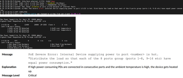 U1-MSG: PoE Severe Error: Internal Device supplying power to port 1/1/5 is hot. Distribute the load so that each of the 8 ports group (ports 1-8, 9-16 etc) have equal power consumption.