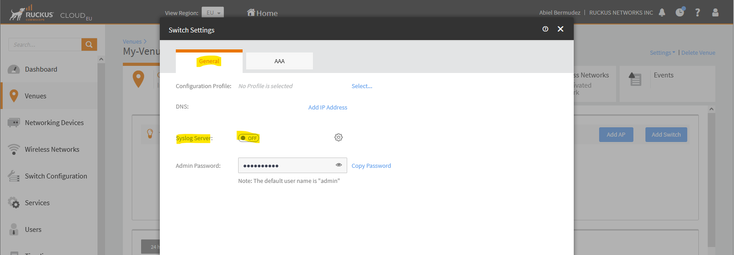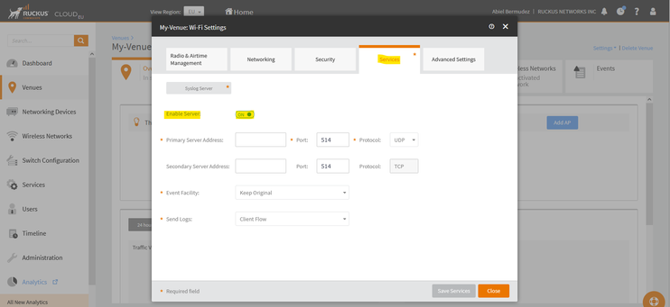 In Ruckus Cloud you can setup a Syslog Server per Venue for Wireless (APs) and Wired (Switches) traffic.