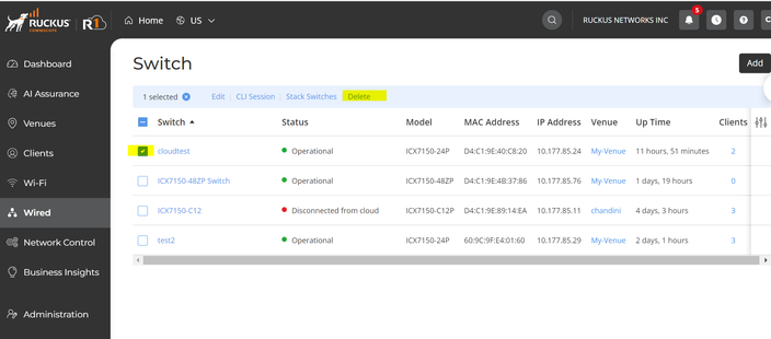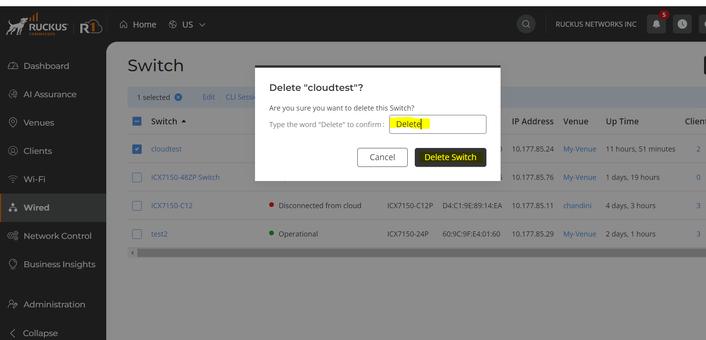 Check the switch to delete and click on delete, then type “Delete” in space provided and delete the switch from cloud