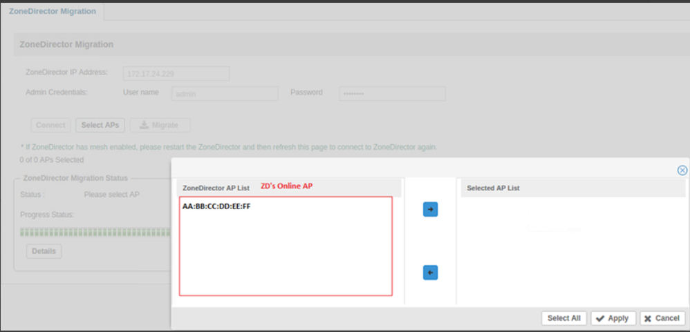 2) Connect ZD → Select AP → Apply AP → Migrate button will be enabled after Apply