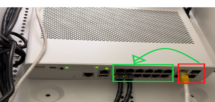 Please help us with pictures of your ICX-7150-C12P Switch showing the status of the lights and cable connections to the Switch ports. Also, light the status of Access Points.