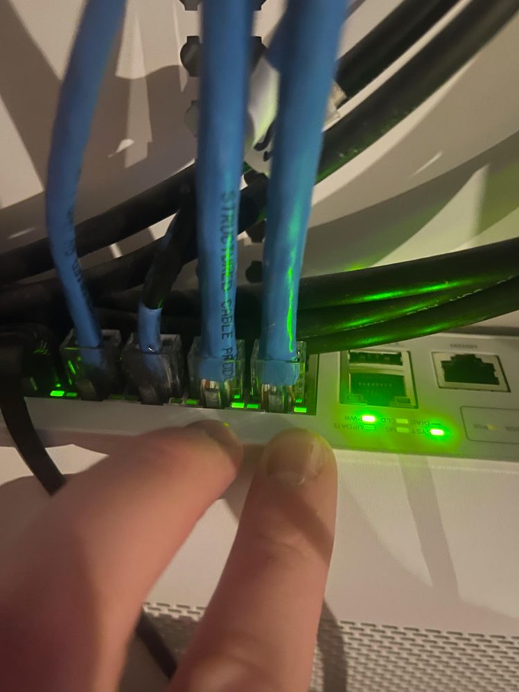 1. On your switch while it's plugged into the outlet, do you see any lights on? (Amber or green) Please let us know which lights are on. (Please refer to the below picture and share a picture of the same, showing the light status and the FULL Switch panel cable connections to the Switch ports)