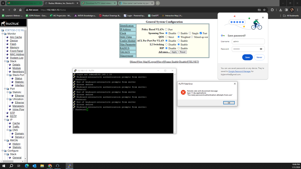 I am having issues. I was travelling and unable to try your solution until today. I was able to download PuTTY (though the link on your page is no longer active) and login to the ip. I follow the steps but the password doesn't match the one I have. I understand that PuTTY doesn't show what you are typing on the password but I tried logging in to my switch by typing my IP into my browser window and I use the same password and login there to access it. Im not sure what is happening. I am unable to execute the commands necessary to fix my issue.