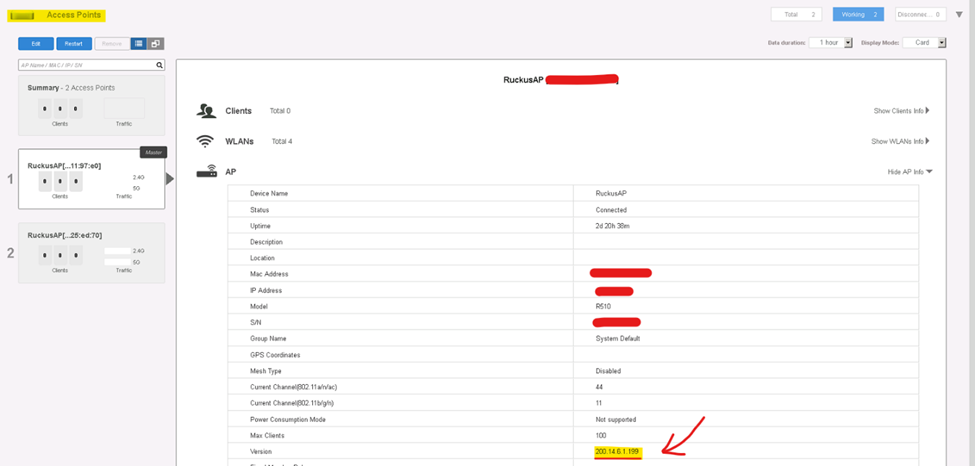 Could you please login to your Unleashed system on a web browser using Master AP IP Address or ‘unleashed.ruckuswireless.com’? Please check the current version of your Unleashed Access Points and share a screenshot of the same.