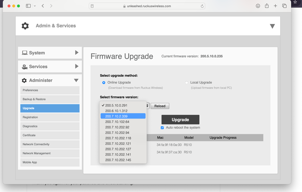 Please follow the below RUCKUS Lennar Knowledge base self-help article which will help you to upgrade the Ruckus AP to a recommended version