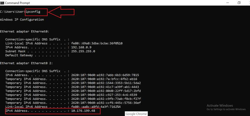 2. Use the command prompt to find the Computer’s IP address using the command ipconfig. Now, we have the IP address of the computer.