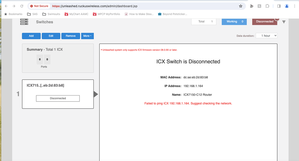 We recently had a power outage and our wifi stopped working well. In the unleashed portal i saw our switch was noted as disconnected. On the physical switch the SYST and PWR Lights  are green and everything appears to be fine same with all of our APs. Research in this portal led me to this post https://community.ruckuswireless.com/t5/RUCKUS-Support-for-Lennar-Homes/Unstable-Lennar-Ruckus-Servi... and I also tried to access via inputing the IP address of switch in browser and login, but non of the various combinations of passwords from the forum worked. When going through the steps in the linked post this was the command line issues i received.