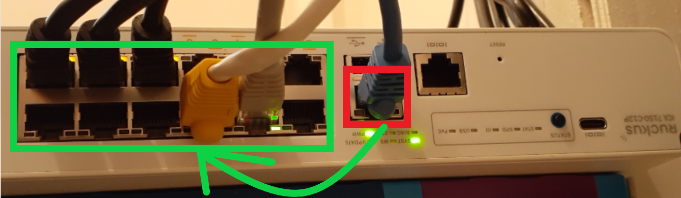 Additionally, from the picture you shared, I noticed that the blue Ethernet cable on your Switch is connected to an incorrect port. Device cables must be connected to one of the ports labeled 1–12. Please unplug the cable and reconnect it to the correct port (refer to the screenshots below).