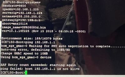 As I've indicated above, my laptop does not have a port for an RJ45 connection.  I do have the Ruckus unit connected to the laptop via the USB-to-USB-C cable and am able to communicate with the device via PuTTY.  I've sent that screenshot where I've attempted to address the ICX7150's environment.  Here it is again.