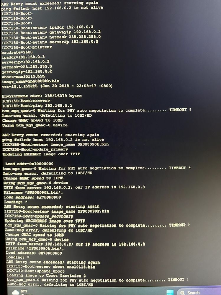 Based on the screenshot you shared, seems like Putty is unable to fetch the firmware files from TFTP server.