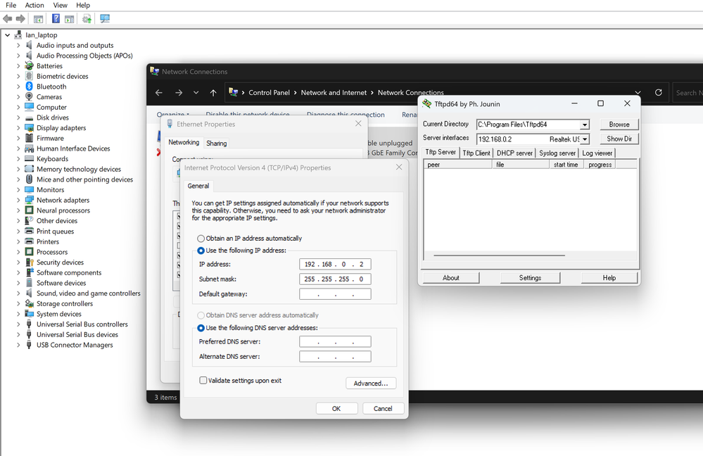 Followed step by step guidelines. Downloaded TFTP and followed those step. Device manager doesnt recognize ports. Tried using both USB C and RJ45. Both do not change anything. I live in a Lennar Home.