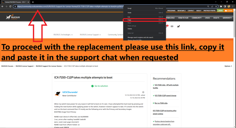 I have a Lennar home in a smart neighborhood where every house has the ICX7150-C12P-2X1G. Mine is no longer powering up and my neighbor mentioned that this device has a lifetime warranty as his failed as well. He called Ruckus, opened a case, worked with support to prove that the device is faulty and won't power up and received a new one and returned the faulty one. How do I initiate that process ?