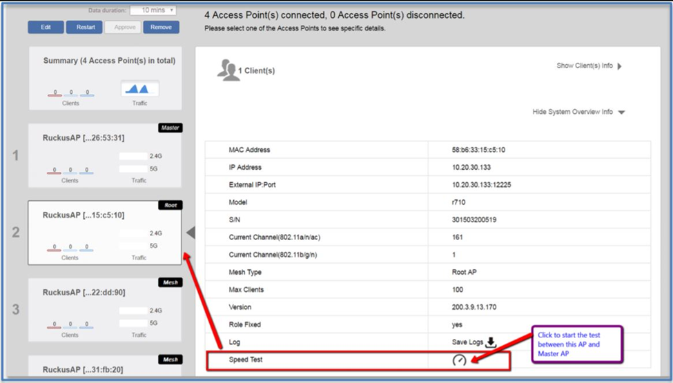3. Additionally, perform a SpeedFlex test to measure the speeds between the Master and Member Access Points. Refer to the screenshot below for the SpeedFlex process.