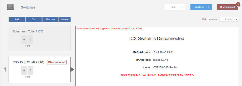 Hello, I own a Lennar home and it seems there are issues with the ICX7150 switch, it is showing as "disconnected" in the dashboard, see photo enclosed. Some devices in our network have issues, very slow speed and some apps don't work. There was a power outage last night if that matters.