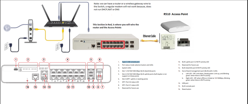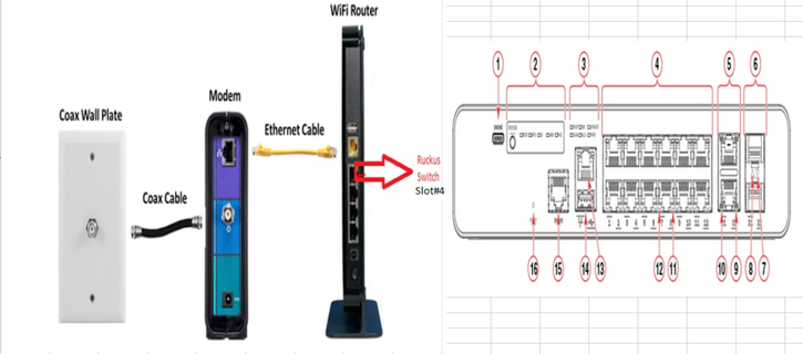 2) In the Below example is a Modem/Router Combo where only needs to connect the orange cable from the Router/modem to 1 of the 12 ports available in the ICX 7150-C12p.
