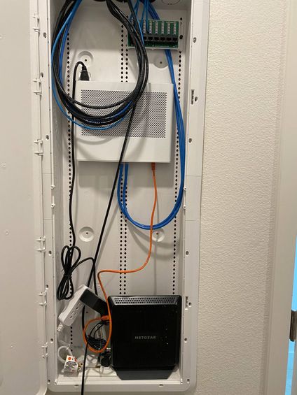 Then in one of the available LAN ports in your Router should be a cable (ethernet) that goes to 1 of the 12 ports in to the ICX -7150-C12P , in these ports is where everything that needs to be connected wired should go example (cameras/doorbell/computers etc.)