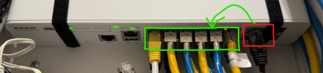 Based on the picture you shared, it appears that the black cable from your Internet Service Provider’s (ISP) router is connected to the incorrect port on the RUCKUS ICX-7150-C12P Switch. The cable should be connected to one of the 1-12 ports on the switch (please refer to the screenshots below). Kindly unplug the cable and reconnect it to the appropriate port. Afterward, please reboot the ISP router by unplugging and plugging it back into the power outlet. Once done, check your internet connection.