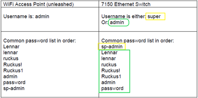 Thanks so much for providing those details, so for the Ruckus switch, none of the provided passwords work in combination with `super` as the username nor `admin` as the username.