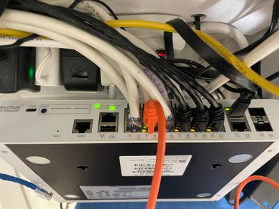 On your switch while it's plugged into the outlet, please let us know which lights are on. (Please refer to the below picture and share a picture of the same, showing the light status and the FULL Switch panel cable connections to the Switch ports)