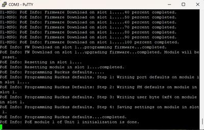Based on the picture you shared, I can see that the RUCKUS Switch now has a green LED for both the PWR and SYST indicators, which confirms that the Switch has returned to its normal state.