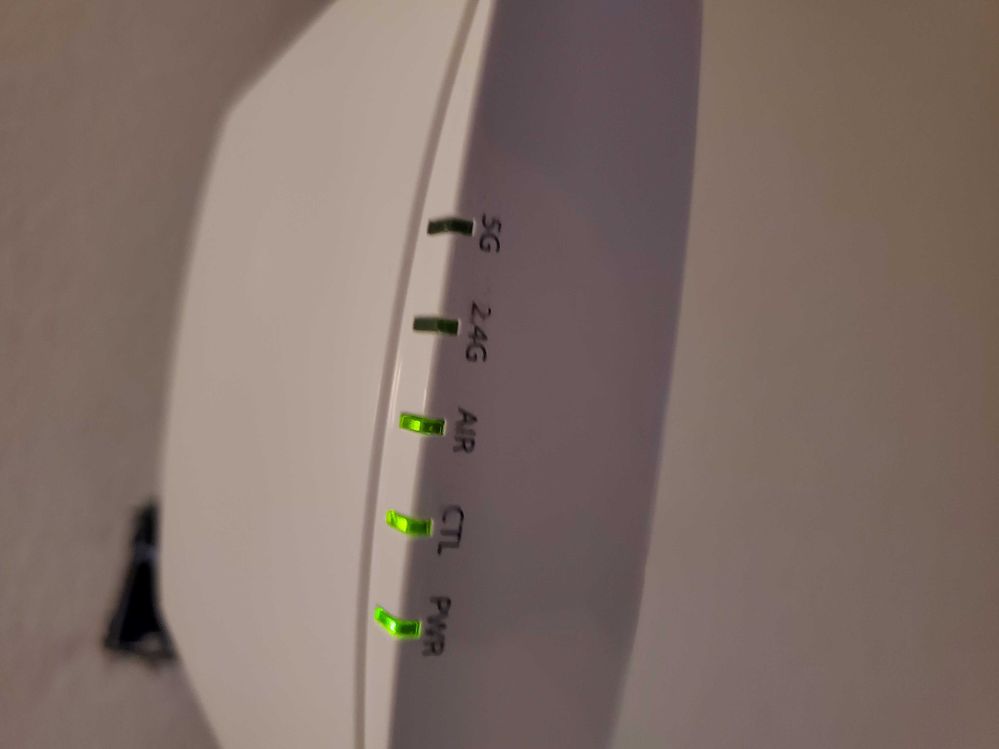 There are two Ruckus R510 access points installed.  One upstairs and one down.  See pics for lights as well.  Note, the lights were a single red LED until I reset them and then the light configuration in the pictures are what we had.  Since the time I stopped trying to configure them, they have both returned to a single red LED.