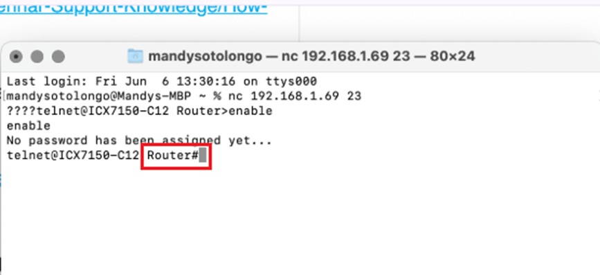 I went back to the terminal and hit enter and it did say "telnet@ICX7150-C12 Router>", so I did each of the commands that were requested. Here are the 3 screenshots after each command. I'm not sure if I did it right but this is what I ended up with.