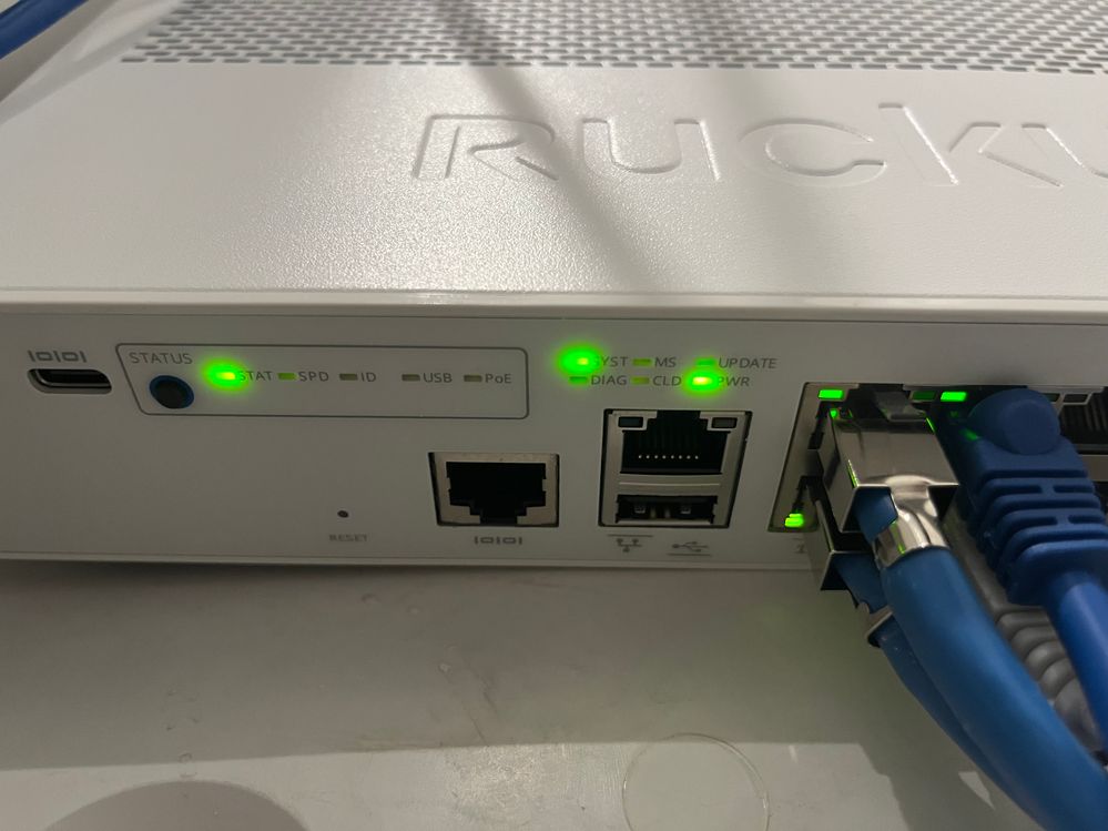 The switch has the STAT light illuminated green within the outline on the far left. And the SYST and Power lights are illuminated green in the array of 6 lights with no outline. The ports are blinking green randomly.