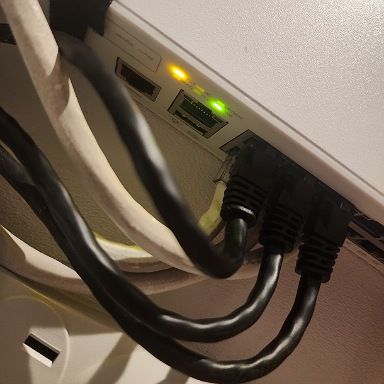 1)   On your switch while it's plugged into the outlet, do you see any lights on? (Amber or green) Please let us know which lights are on. (Please refer to the below picture and share a picture of the same, showing the light status and the FULL Switch panel cable connections to the Switch ports)
