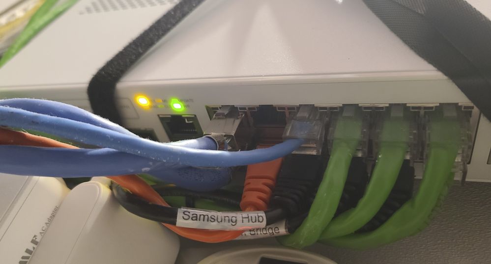 1) On your switch while it's plugged into the outlet, do you see any lights on? (Amber or green) Please let us know which lights are on. (Please refer to the below picture and share a picture of the same, showing the light status and the FULL Switch panel cable connections to the Switch ports)