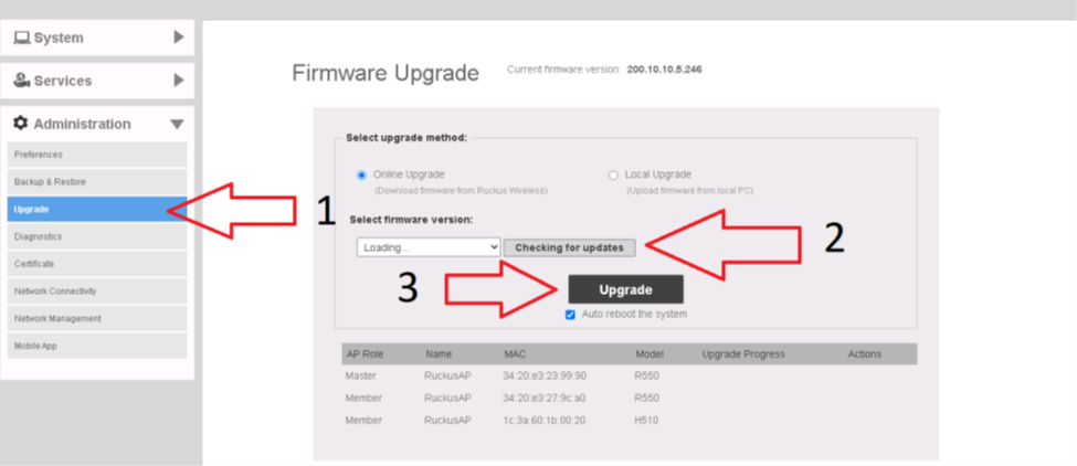 Online upgrade method to upgrade your Unleashed network with the latest firmware available from the RUCKUS Unleashed firmware server.