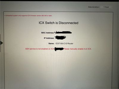 I was able to get my Switch back and log onto my account via the web. I am now getting these messages: “Unleashed system only supports ICX firmware version 08.0.90 or later” and “SSH service is not on ICX [insert IP address]. Please manually enable it on ICX”.