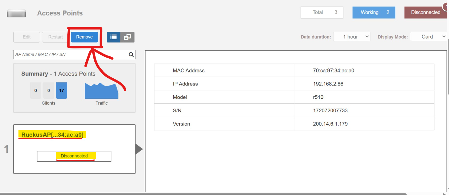 1. Remove the disconnected Access Point from the Unleashed System (refer to the screenshot below).