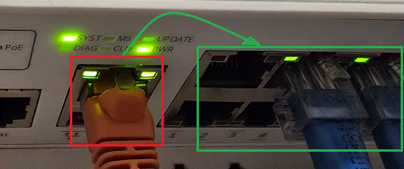 1. On your switch while it's plugged into the outlet, do you see any lights on? (Amber or green) Please let us know which lights are on. (Please refer to the below picture and share a picture of the same, showing the light status and the FULL Switch panel cable connections to the Switch ports)
