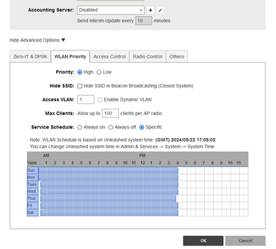 You can configure the service schedule time in the WiFI network>>WLAN>>Show advance option>>WLAN priority option>>Service schedule